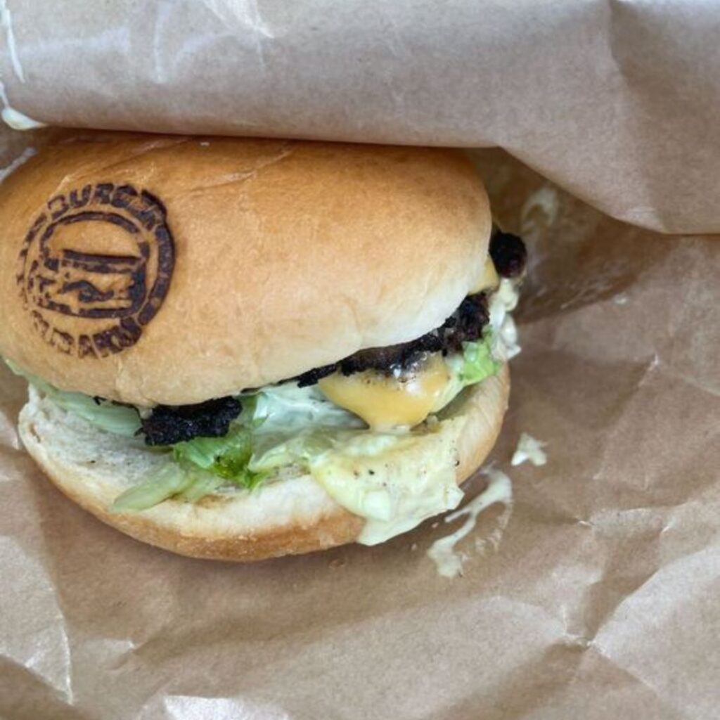 遠目からでも分かるような近江牛100%ハンバーガーの文字とハンバーガーのイラスト。 そのおかげで迷うことはありません。ドライブスルーも利用できるようです。 店内には観葉植物に囲まれたおしゃれな空間が広がっています。 メニュー表も大きいため内容がとても分かりやすいです。