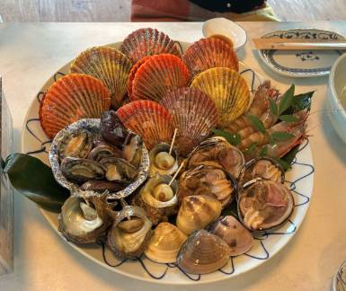 落ち着いた雰囲気の店内から見える浦ノ内湾と、地場で獲れた貝を贅沢にいただける「浮橋」。貝は店員さんが焼いてくださるので、焼き方が分からない、という方も安心して来ていただけると思います。