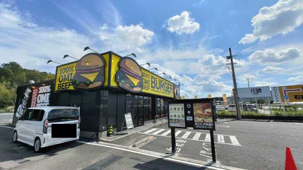 遠目からでも分かるような近江牛100%ハンバーガーの文字とハンバーガーのイラスト。 そのおかげで迷うことはありません。ドライブスルーも利用できるようです。 店内には観葉植物に囲まれたおしゃれな空間が広がっています。 メニュー表も大きいため内容がとても分かりやすいです。