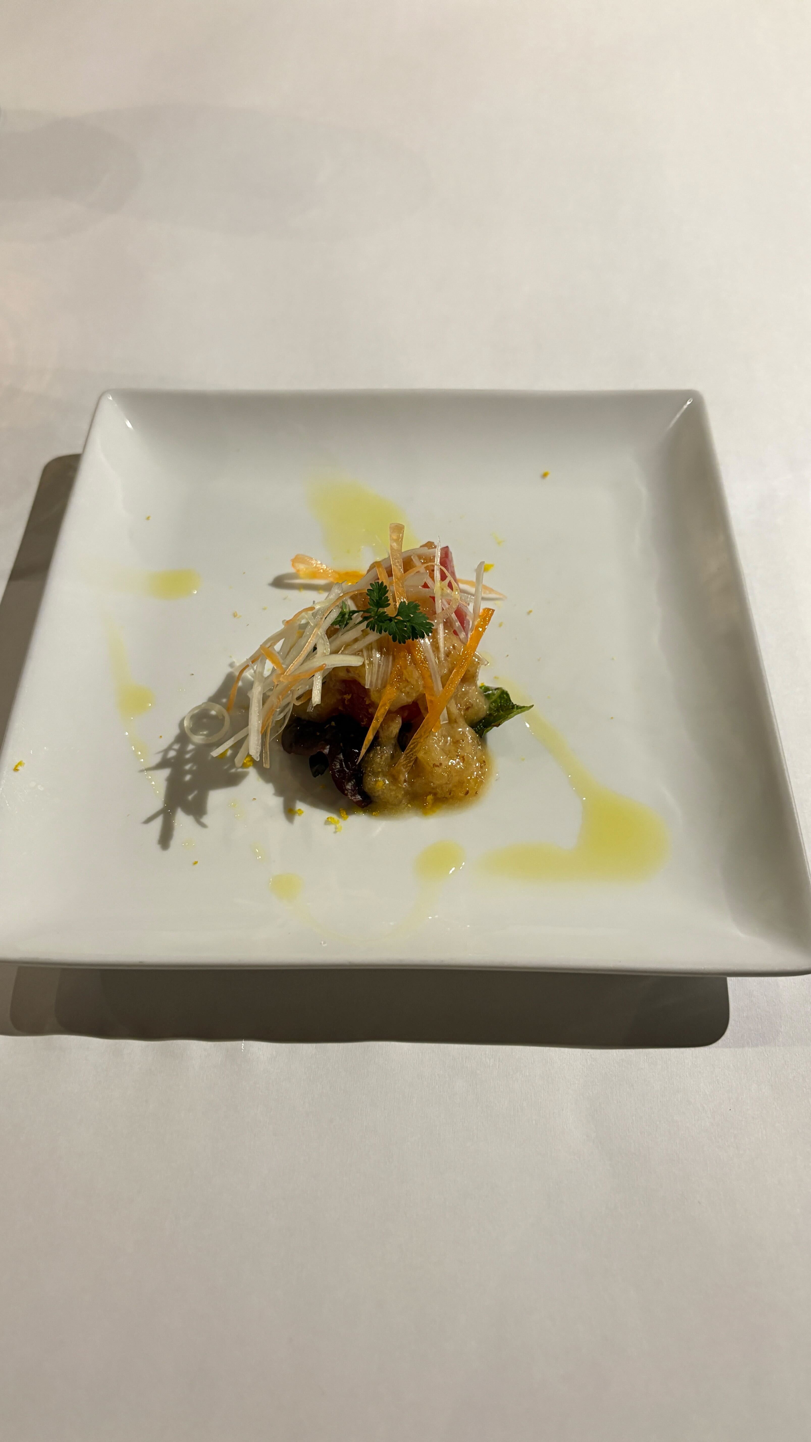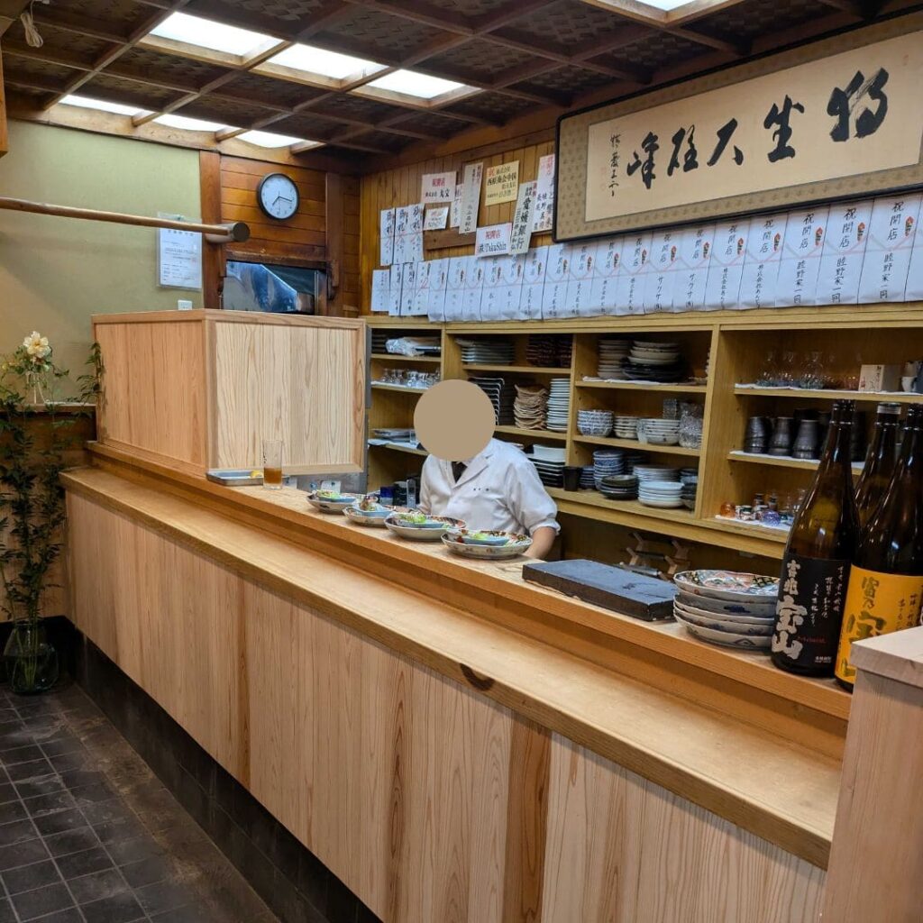 とても趣のある外観でした。 日本料亭のイメージそのままの店先で、落ち着いた雰囲気があります。 入店してすぐに厨房があり、美味しそうなお料理が並んでいました。 木を基調としたカウンターに風情を感じながら、席に案内されました。