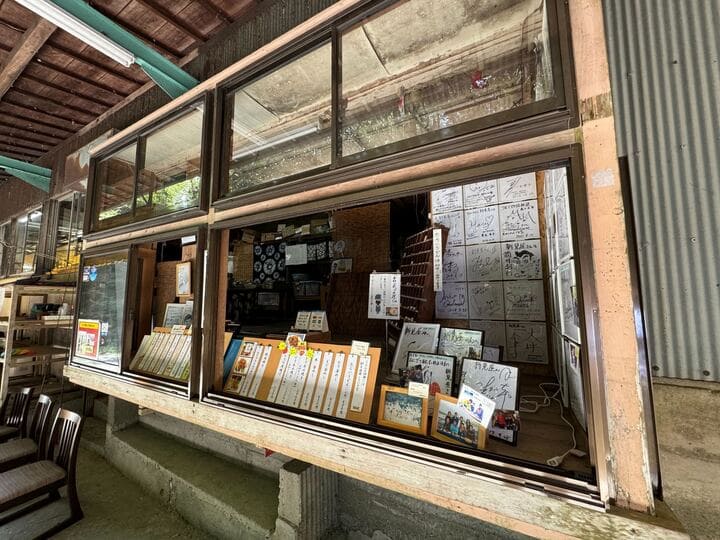 歓迎のゲートをくぐると、一転、客を選別するかのごとく、長い長い下り階段が待ち構えています。 ここを通れない者は、たらいうどんにありつくことはできません。 個室もあります。 外の川を眺めながら、落ち着いて食事ができます。 換気扇も完備されており、あみ焼きしている時も比較的快適でした。
