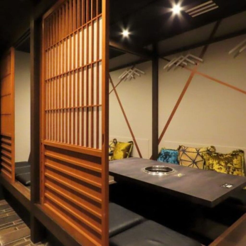 夜の街に佇む、高級感あふれる外観に魅了されます。 座席がお店の奥のほうにあるため、外から見るだけでは焼肉屋とは思えないでしょう。 外観が焼肉屋とは思えず迷ってしまうので、行く場合は写真の外観を覚えておくのが良いです! 掘りごたつになっているので、ゆっくり腰かけてお食事できます。 今回は大人数のため、仕切られていない席にご案内していただきましたが、個室の席もあるため、自分たちだけの空間を楽しみたい人にもオススメです。