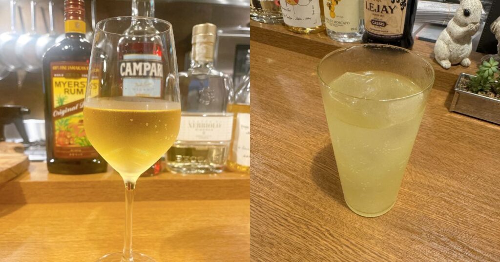 tomaricoのドリンク 自家製黄柚子 チェッロ ソーダ割り と 白ワイン(ルナーリア・マルヴァジア)