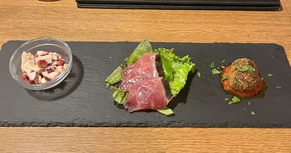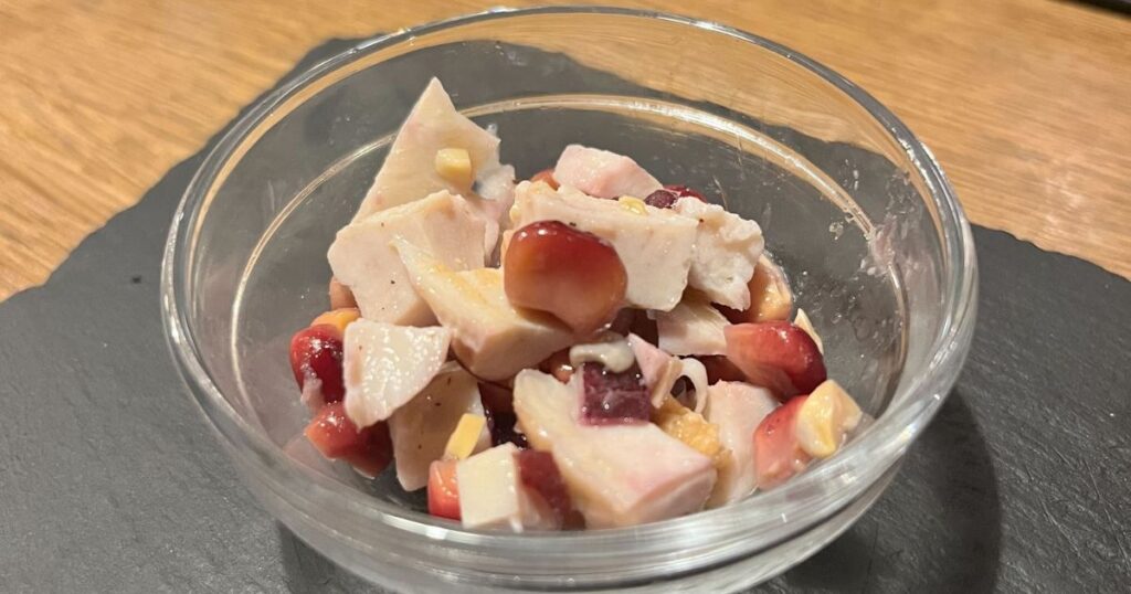 最後にいただいた前菜が宇治小倉産大和ルージュと土佐はちきん地鶏の胸肉のサラダ。